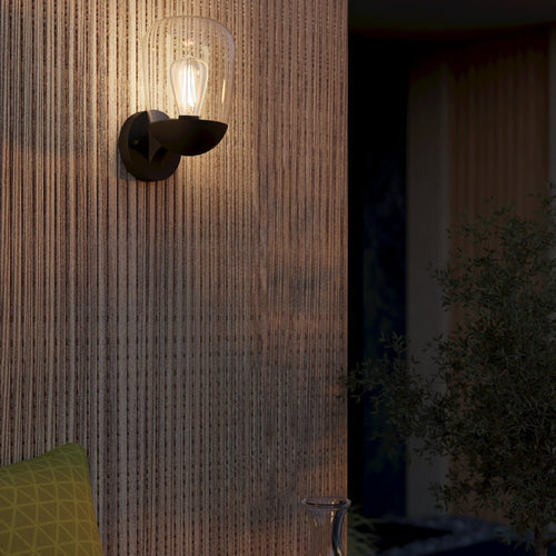 The DONATORI exterior wall light features a black aluminium mount and a rounded clear glass shade. The lightbulb inside is visible through the glass. This exterior wall light has IP44 protection against spray water and is suitable for outdoor use. The product's modern style beautifully complements outdoor spaces. The pictured filament lightbulb is not included. The product has an E27 lamp holder and requires 1 E27 lightbulb.