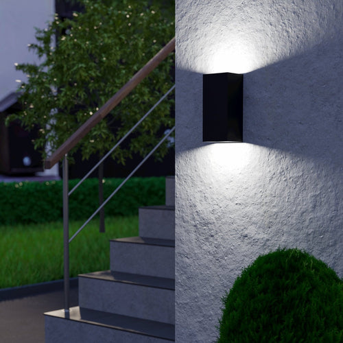 The EREMITANA exterior LED wall light has a square, zinc-plated metal body in black. The included GU10-LED lightbulbs produce a pleasant warm white light and cast an indirect light on the wall due to the up and down design. The wall light has IP55 protection against dust and low-pressure water jets and is suitable for outdoor use. With this modern design, the product blends into any outdoor area, whether a wall, the entrance area or on the terrace.