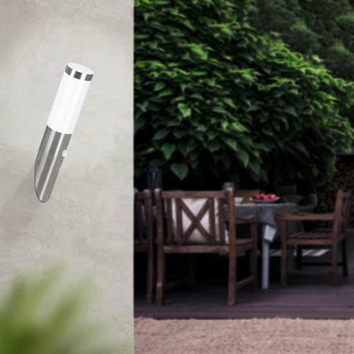 The HELSINKI exterior wall light features a cylindrical stainless steel body with a white plastic 360° light panel in the upper half. The wall light is fitted with a motion sensor and comes on automatically, lighting up poor visibility areas and deterring unwanted visitors. The integrated twilight sensor gauges the ambient light level, so the light only switches on when needed. The slanted body of the wall light provides modern lighting reminiscent of a flaming torch. It has IP44 protection against spray water and is suitable for outdoor use. Due to its classic design, the exterior light blends into any modern outdoor space. The wall light will fit any bulb (A60) with an E27 socket, lightbulb not included.
