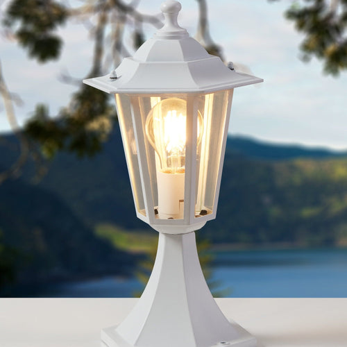 The lantern-style LATERNA 5 exterior post light has a white cast aluminium body with clear glass panes. The product is suitable for outdoor use due to its IP44 protection against spray water. With its classic design, the light blends into outdoor spaces with a wide range of styles and provides lighting that suits settings such as traditional-style or art nouveau city villas. The pictured lightbulb is not included. The product has an E27 lamp holder and requires an E27 lightbulb.