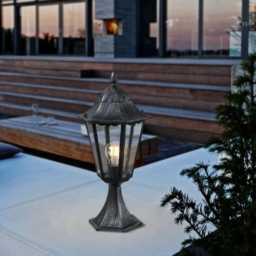 The lantern-style NAVEDO pedestal light has a cast aluminium body in a black and silver-patina finish with clear glass panes. The exterior light is suitable for outdoor use due to its IP44 protection against spray water. The product has a classic design, blending into outdoor spaces such as traditional-style or art nouveau city villas. The product has an E27 lamp holder and requires 1 x E27 lightbulb, which is not included.