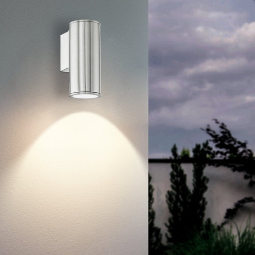 The RIGA exterior LED wall light has a cylindrical stainless steel body with a clear glass cover at each end. The product includes a GU10 LED lightbulb, which produces a pleasant warm white light. With its modern downlight design, this wall light blends into almost any outdoor area and provides stylish indirect lighting for external house walls. The product is suitable for outdoor use due to its IP44 protection against spray water.
