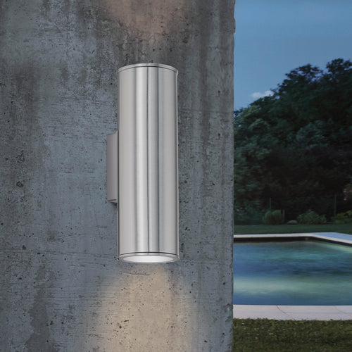 The RIGA exterior LED wall light has a cylindrical stainless steel body with a clear glass cover at each end. The product includes GU10 LED lightbulbs, which produce a pleasant warm white light. With its modern up and down design, this wall light blends into almost any outdoor area and provides stylish indirect lighting for external house walls. The product is suitable for outdoor use due to its IP44 protection against spray water.