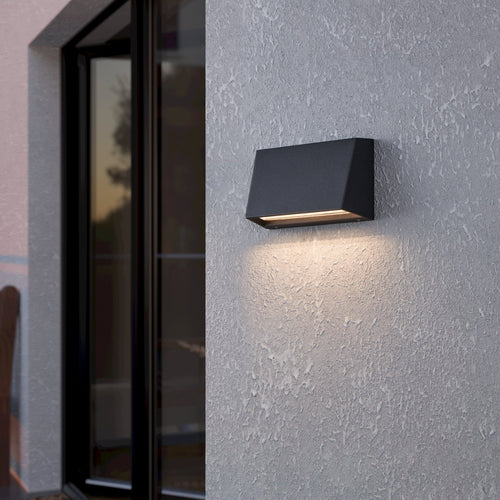 The SPONGANO LED outdoor wall light features an angular anthracite-coloured aluminium housing and a clear plastic shade. The product is suitable for outdoor use due to its IP65 rating, giving protection against jets of water and dust. The fixture's light is adjustable, making it possible to switch the outdoor light between different light temperatures; 3000K, 4000K, 5000K and 6500K. The minimalist and straightforward design blends seamlessly into almost any outdoor space and offers stylish lighting on your house wall.