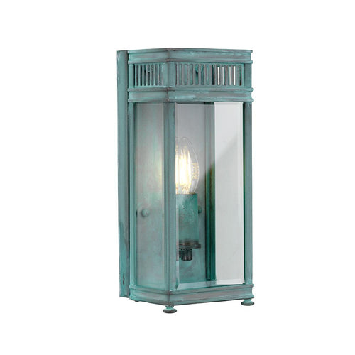 The 1 light Holborn is a English inspired design from the Victorian era, constructed in Solid Brass with a Verdigris finish and clear glass. IP44 rated and offered with a Limited Lifetime Warranty.