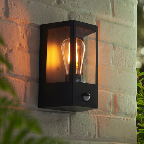 This black painted exterior wall light combines contemporary styling with sensor technology. Housed in a minimalist cubed frame with clear glass panels, it features an integrated PIR motion sensor for automatic illumination—ideal for enhancing security and convenience around entrances, pathways, or gardens. Designed for durability and weather resistance, it offers reliable outdoor lighting with modern appeal.