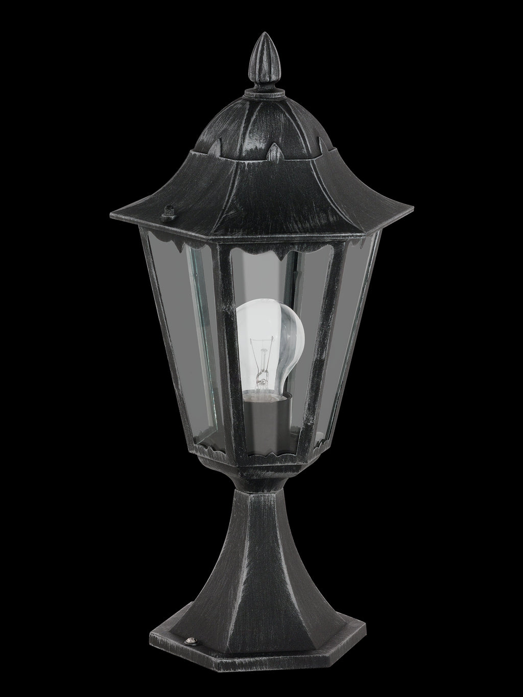 The lantern-style NAVEDO pedestal light has a cast aluminium body in a black and silver-patina finish with clear glass panes. The exterior light is suitable for outdoor use due to its IP44 protection against spray water. The product has a classic design, blending into outdoor spaces such as traditional-style or art nouveau city villas. The product has an E27 lamp holder and requires 1 x E27 lightbulb, which is not included.