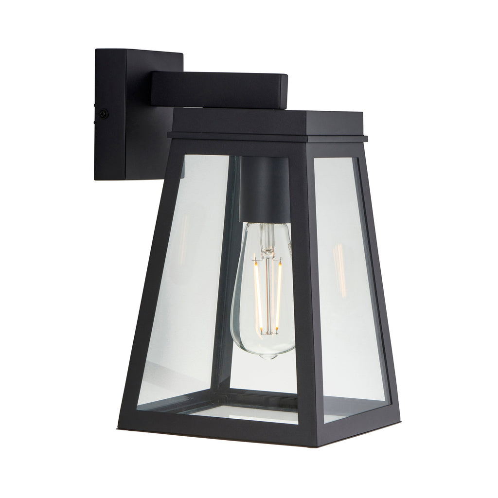 Stylish take on traditional lantern designs, given a modern update for classic architecture of today. This wall light is made from weather-resistant die-cast aluminium and steel in a matt black finish. Perfect for use with an E27 LED filament lamp.
