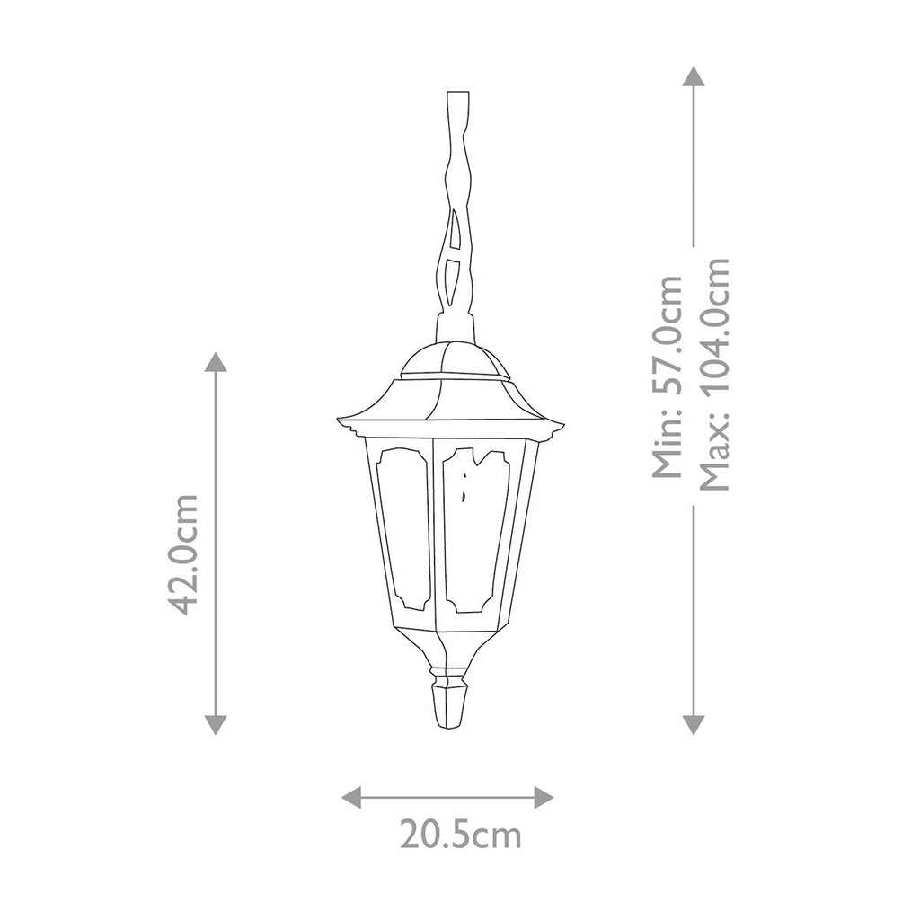Experience timeless elegance with the Parish Black Outdoor Chain Lantern. Expertly crafted in the UK from durable die-cast aluminium and glass, this lantern features a sleek black powder-coated finish that complements any outdoor space. Designed with meticulous attention to detail and built to last, it comes with a 10-year guarantee for your peace of mind. Shop confidently with the UK’s leading lighting specialists and enjoy free 90-day UK returns.Adjustable Drop | 104cm/40.9" |